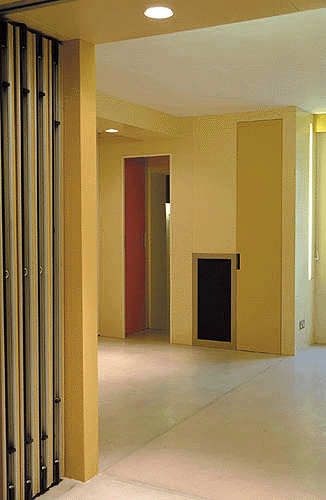 The brief asked for multiple functions in a space which could also be used as a single large volume: a home cinema, two offices and a bedroom. The scheme accommodates all of these demands by making walls and furniture that fold away. The colours of all elements, walls, floors, and furniture, are coordinated to ensure that despite its various reconfigurations the whole space remains visually coherent.